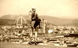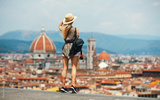 Young attractive smiling girl tourist in hat exploring new Europe city at summer holiday at Florence