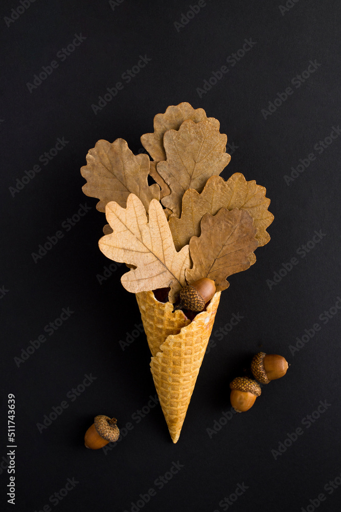 Ice cream cone with dry oak leaves and acorns on the black background. Closeup. Location vertical.