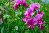 pretty sweet pea flowers growing in summer. small pink wildflowers on riverbank. beautiful floral background