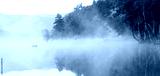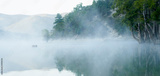 Mountain lake in the morning fog. Cypresses growing out of the water are reflected in the water through a veil of fog. Silence. Awakening .