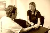 Doctor measures patient's temperature with non-contact thermometer during an appointment in clinic