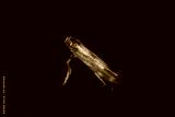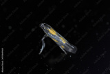 Tiny moth yellow and black on black background.