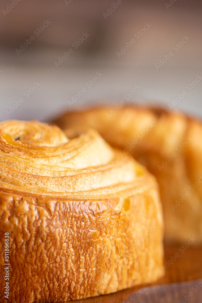 Croissant macro. French croissant with waves. Air baking. Croissant for puff pastry advertising. Croissant for a magazine.French breakfast with pastries. From puff pastry. Bun from France. Roll macro