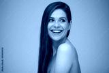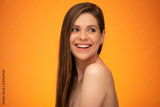 Happy Smiling woman looking away over shoulder. Girl with long hair and bared shoulders. Isolated female person portrait.