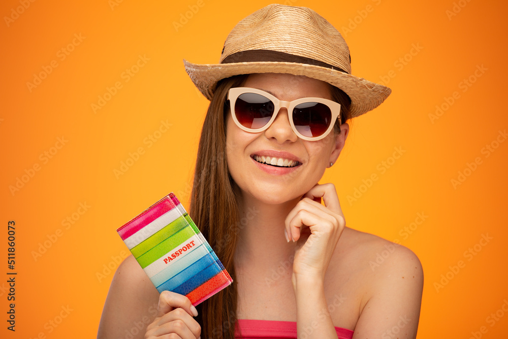 Happy woman tourist in Mexican hat wearing sunglasses and holding passport waiting on summer trawel. solated face portrait with bare shoulders on orange yellow background.