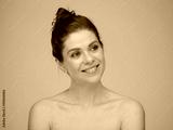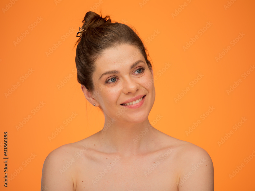 Smiling woman with bare shoulders and bun hairstyle looking away, isolated portrait in beauty style, girl face portrait with natural no retouching skin.