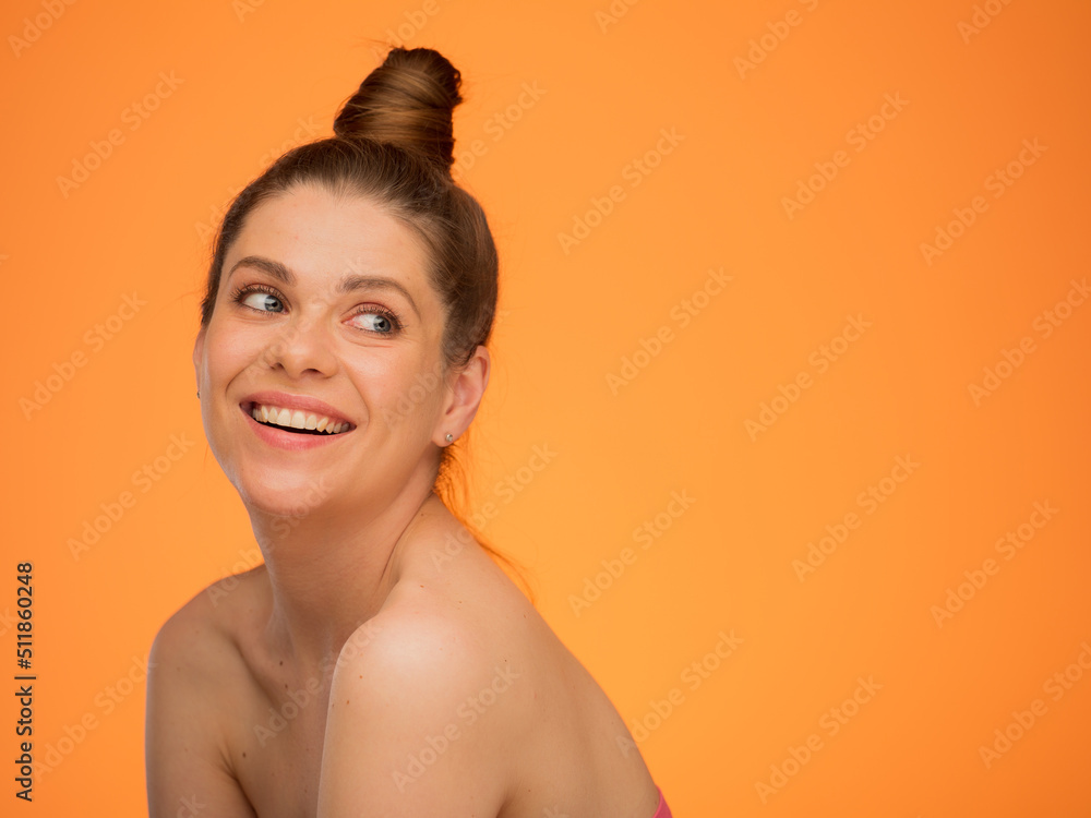Happy dreaming woman looking back over her shoulder, isolated portrait on orange back with happy girl bare shoulders and bunch hair dress.