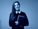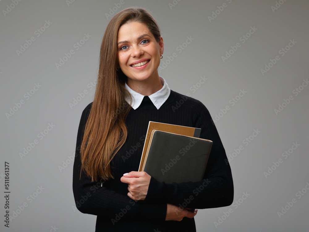 Happy female teacher or student in black business suit with white collar holding book, isolated portrait of businesswoman.