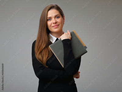 Smiling woman teacher or student in black business suit with white collar and long hair holding book, isolated portrait of businesswoman.