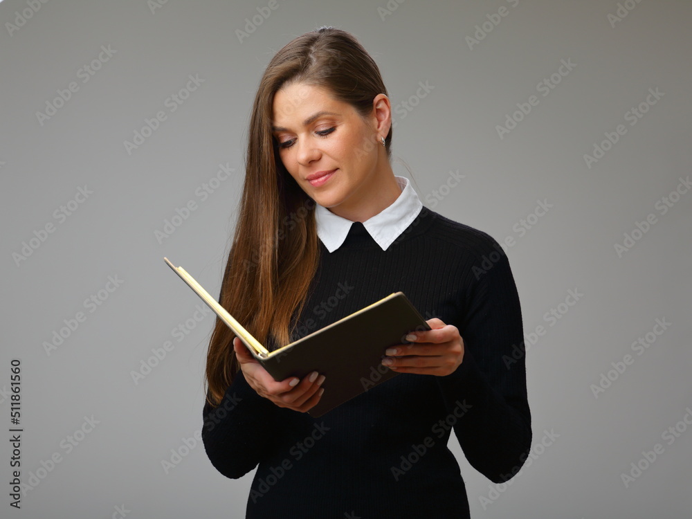 Serious woman teacher or student in black business suit with white collar reading open book, isolated portrait of businesswoman.