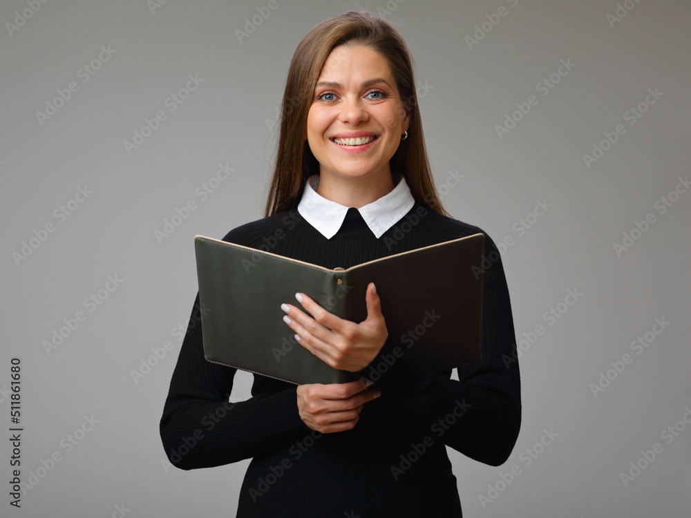 Smiling woman in black business suit with white collar and long hair holding open book in front of her, isolated portrait of businesswoman.