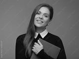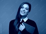 Woman teacher in black business suit with white collar holding book, isolated female portrait.