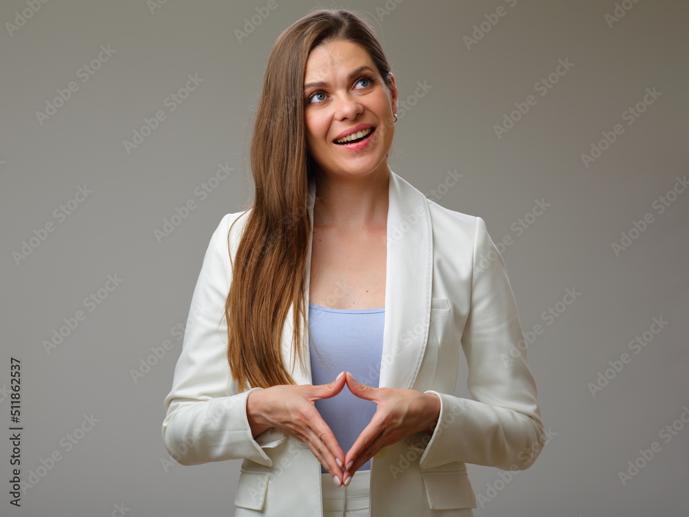 Young thinking woman in white suit looking up, studio isolated portrait.
