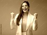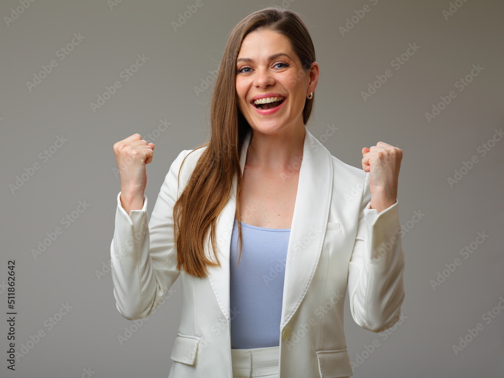Female power concept portrait with woman in white suit, studio isolated.