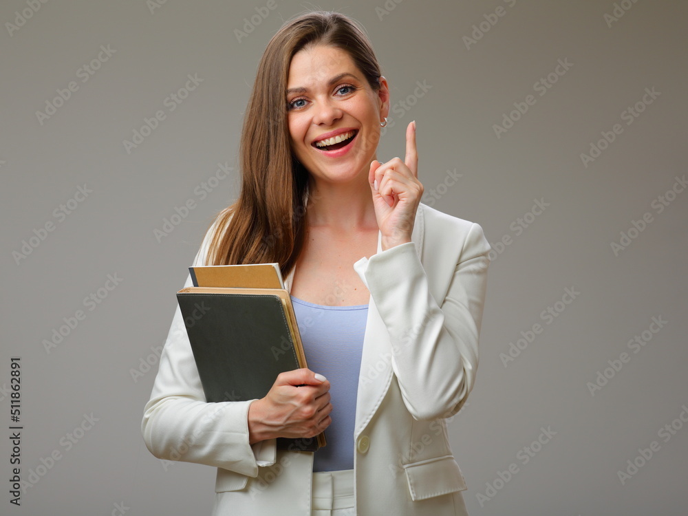 Isolated portrait of smiling female teacher pointing finger up, woman wearing white business suit holding book.