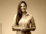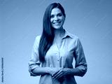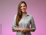 Smiling happy woman with long hair standing with folded hands, isolated female portrait on pink.