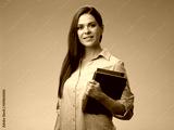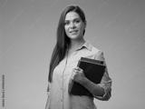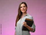 Smiling woman teacher or student holding books, isolated portrait on pink.