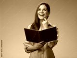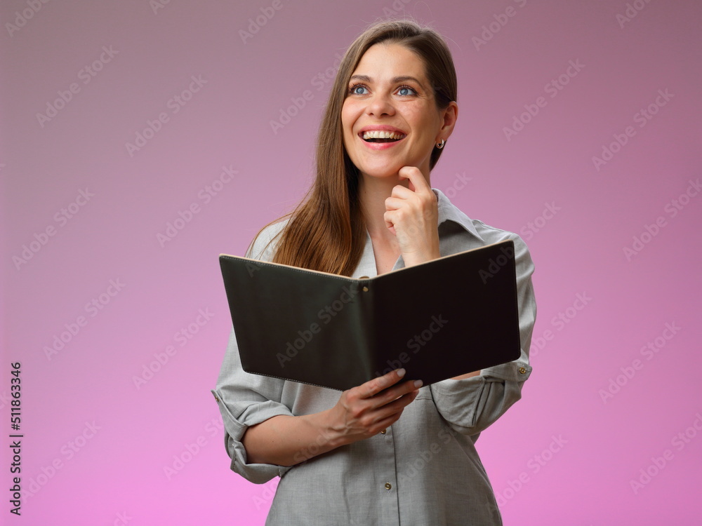 Happy teacher or student woman holding book and looking up, isolated portrait.
