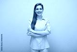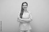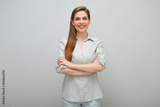 Smiling woman standing with arms crossed, isolated female studio portrait, young lady dressed pants and gray shirt