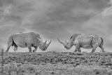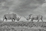 Pair of white rhinoceros or square-lipped rhinoceros, Ceratotherium simum standing face to face during the sunset territory fight, Ol Pejeta Conservancy, Kenya, East Africa