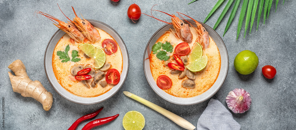 Tom yum kung Spicy Thai soup with prawns in a bowl. Gray concrete background. Top view, flat lay. Banner