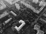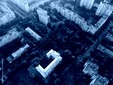 Aerial view on school buildings in green summer residential district in sun light. Fly above streets in morning city. Treetop view on Kharkiv, Ukraine