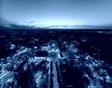 Aerial view on vivid evening cityscape, Ferris wheel and entertainments panorama. Kharkiv city center in sunset light, amusement Gorky Central Park, Ukraine