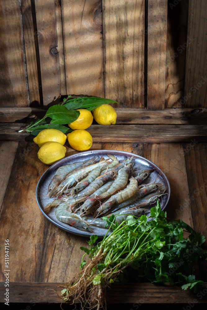 Raw shrimps prawns on gray plate with lemons and cilantro. Top view , wooden background