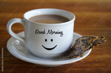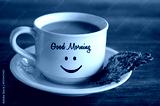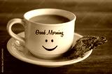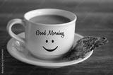 Closeup of white cup of morning coffee with Good morning greeting and a smile emoticon on it and healthy seed crackers on a plate on brown wooden table.