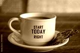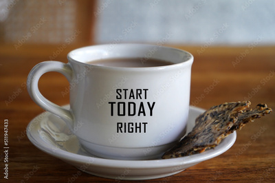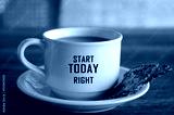 Morning coffee with crackers on the table with inspirational and motivational quote on the cup - Start today right.