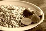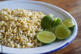 Short bean sprouts with slices of green lemon on a white plate. Preparing Indonesian rawon soup food, legendary culinary typical of East Java.