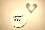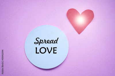 Text message on white circle paper - Spread love. With red heart - a love shaped with light shine on pink purple background. Love and kindness inspirational words concept.