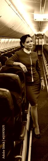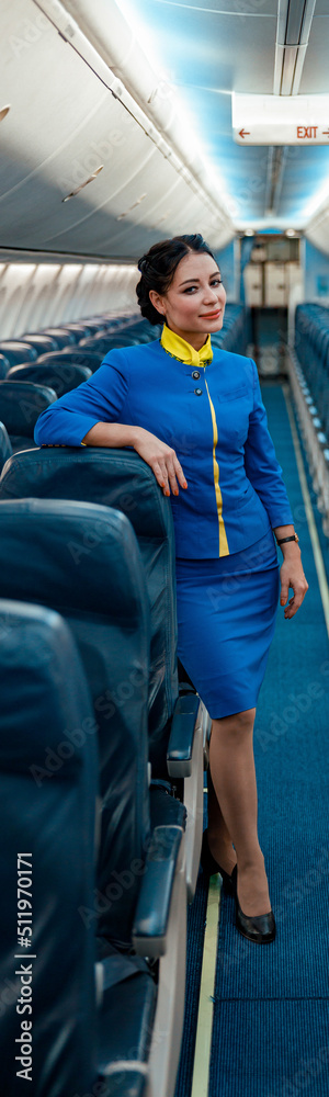 Joyful women stewardesses in air hostess uniform looking at camera and smiling while standing near passenger seats inside airplane