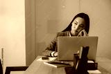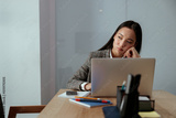 Portrait of tired beautiful business asian woman working in office use computer and looking away