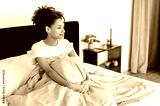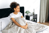 The start of a new day. Satisfied pretty African American curly girl in a white t-shirt, slept well, sits in bed in her cozy bedroom in the morning, starts a new day with positive thoughts and a smile