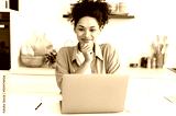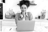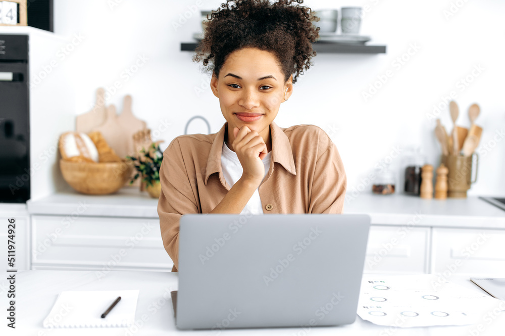 Portrait of a beautiful positive mixed race curly girl in casual clothes, designer, freelancer, sitting at a table with a laptop, working remotely from home, looking at the camera, smiling friendly