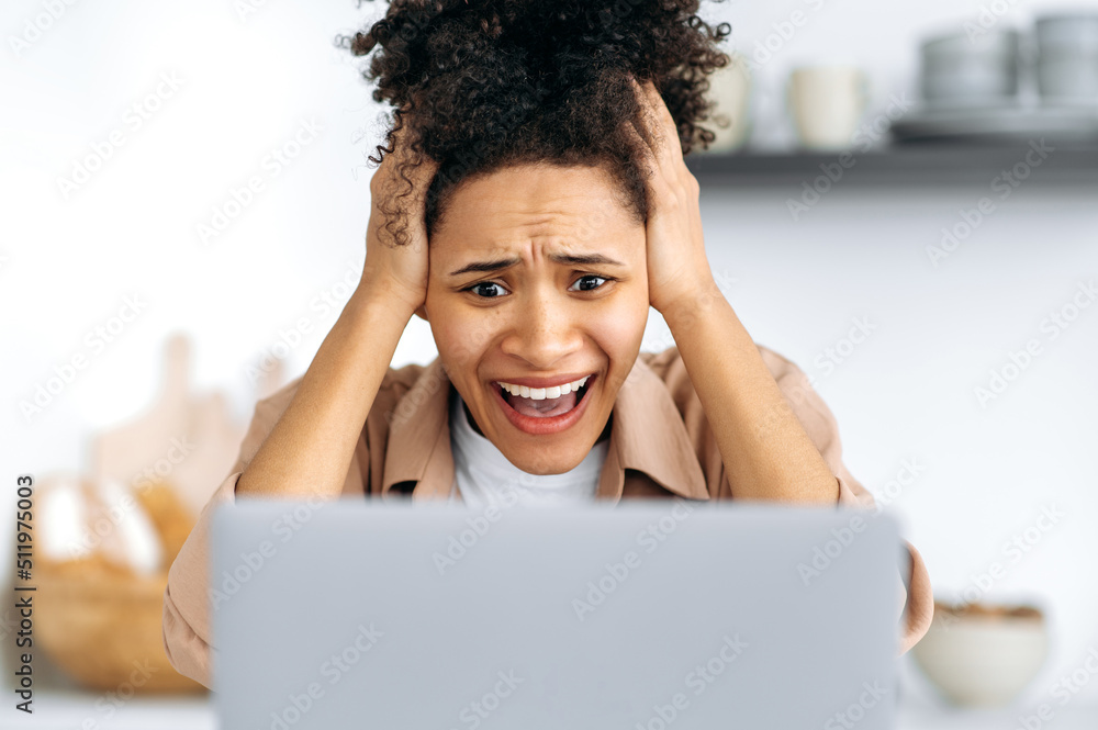 Unhappy sad puzzled African American curly haired girl, manager, stock broker, designer, looks at the laptop screen with shocked, saw unexpected bad news, failure of the project, holding hands of head