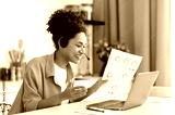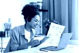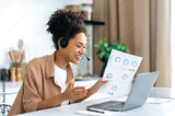 Positive pretty african american curly-haired young woman with headset, dressed in casual wear, working or studying from home uses laptop, talking on video conference, conducts financial consultation