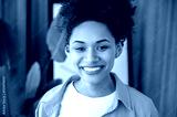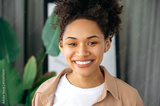 Close-up of a joyful beautiful African American young curly haired woman, with freckles, perfect white manicured teeth, stands in apartment, looks directly at the camera, with happy toothy smile