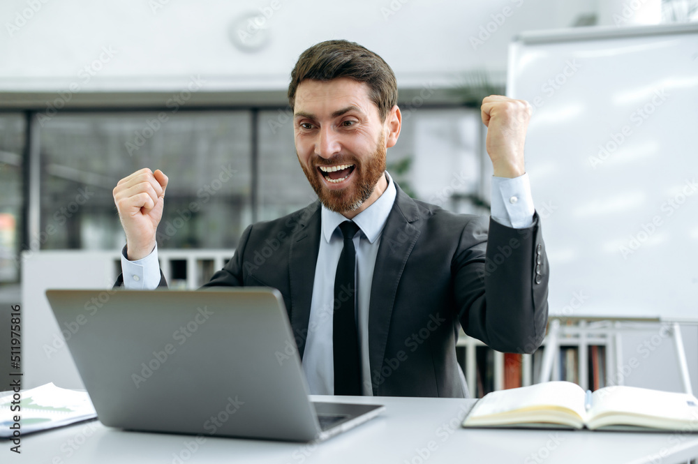 Lucky happy Caucasian business man, sales manager, executive, sits in front of a laptop screen at his desk, in a modern office, insanely happy about a great deal, big profit, gesturing with his fists