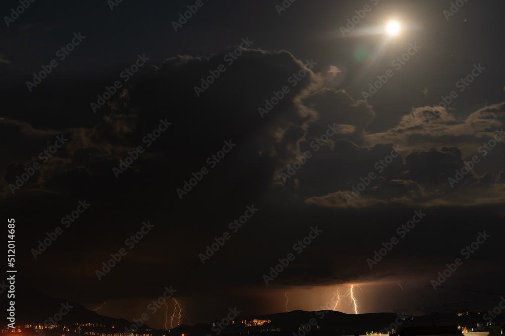 Night thunderstorm in the light of the moon. Amazing view