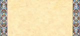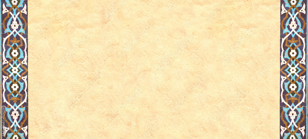 Detail of traditional persian mosaic wall with geometrical and floral ornament, Iran. Horizontal frame with ceramic tile