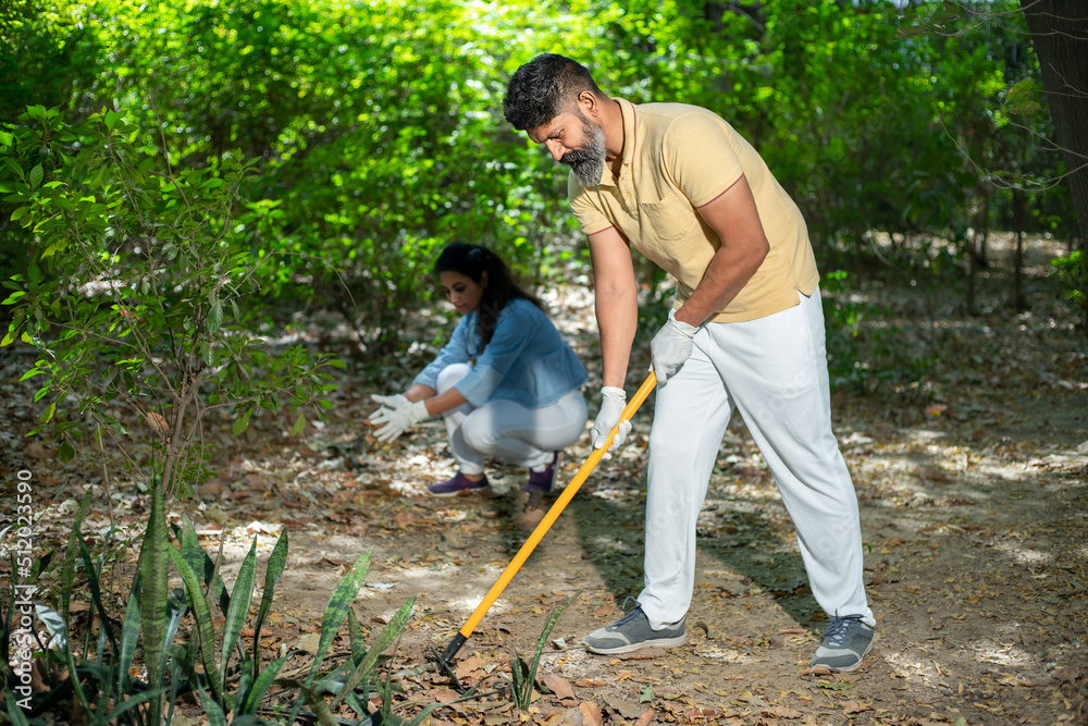 Indian people volunteer cleaning fallen leaves in the forest or nature, Spring cleaning in park, asian couple clean outdoor trash.
