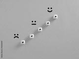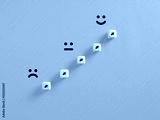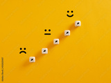 Arrows on wooden cubes pointing from a sad expression towards a happy one. Personal growth and aspiration