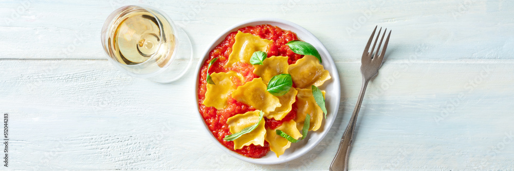 Ravioli with tomato sauce and basil with a glass of white wine, a panorama for an Italian restaurant menu, overhead flat lay shot