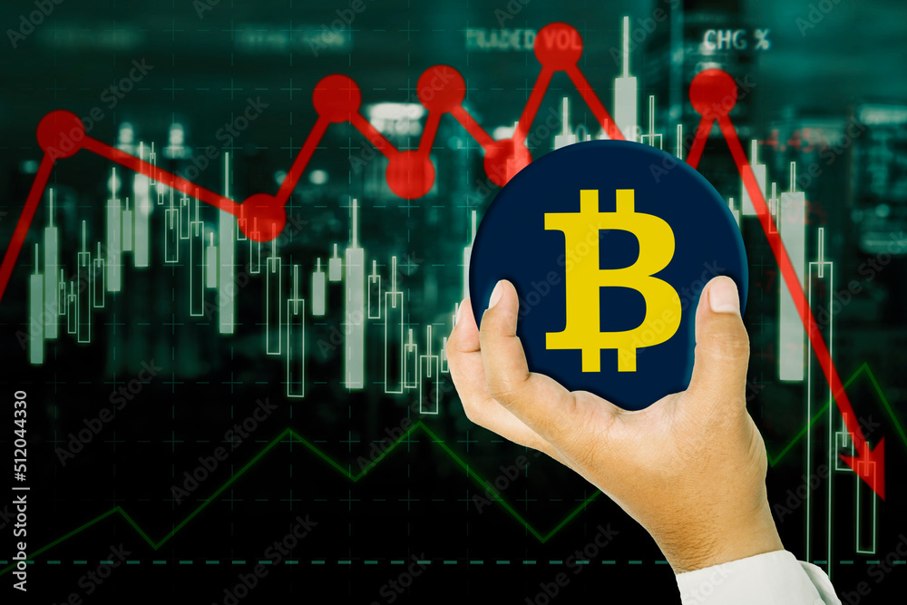 Businessman hold bitcoin with declining price chart