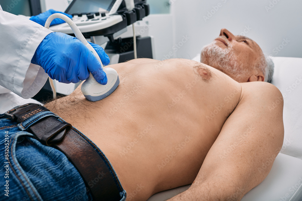 Abdominal ultrasound with ultrasound machine for male patient, close-up