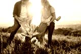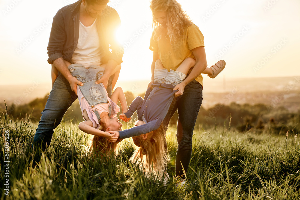 Family with two daughters have fun at the meadow during the sunset