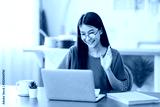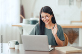 Happy positive young asian woman enjoying online communication at home, Female using wifi while video conferencing with friend, sitting in front of open laptop, smiling and waving hand, saying hi