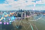 Aerial panoramic helicopter city view on Lower Manhattan district and financial Downtown, New York, USA. Forex graph hologram. The concept of internet trading, brokerage and fundamental analysis